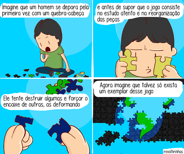 Eu vi a necessidade de compartilhar este projeto com vocês. Essa página de face tem ótimas tirinhas, e possui um conteúdo de excelente qualidade. Coisas boas assim devem ser compartilhadas, que tal embarcar em um mundo de reflexão e filosofia através de quadrinhos e arte? Então vamos lá! Os assuntos tratados nas tirinhas são em sua maioria críticas e reflexões sobre as situações do cotidiano, sobre o mundo, sobre eu, sobre você. São tirinhas feitas para chocar, para alertar e para fazer você pensar. As vezes o que nós precisamos é de um aviso para darmos o primeiro passo para a mudança.