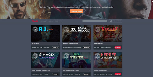 Caso não tenha entendido bem, vou explicar novamente. A Humble Bundle no mês de Abril está mostrando três jogos que virão no pacote para uma espécie de vitrine e fazer as pessoas assinarem apenas por aqueles jogos, pois pode acontecer de vir jogos surpresas que você não goste. Mas pelo preço de 12 dólares, é óbvio que você vai assinar se estiver interessado em alguns destes jogos. Quem não assinaria? Compensa muito!