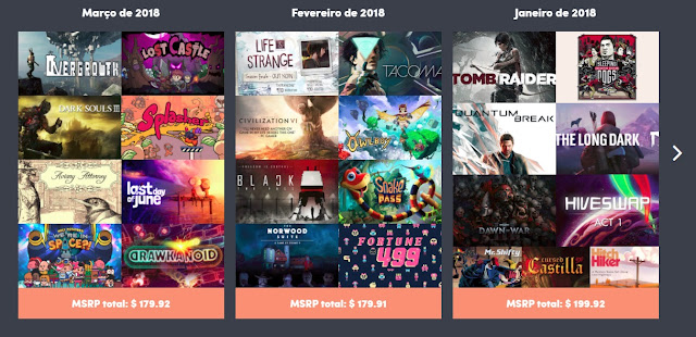 Outro ponto é que eles colocam os jogos que vieram nos meses anteriores e embaixo uma soma de valores dos jogos em dólares por que o site é em inglês, é um valor para mostrar quanto ficaria se fossem comprados separadamente. Ou seja, os jogos que comprei no box de Março que paguei $12,00 sairia por $179,92 se eu fosse comprá-los separadamente. Uma diferença muito grande!