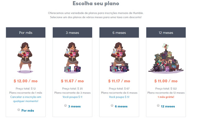E se assim como eu, você não quer ter um plano por três meses ou um ano todo, a Humble Bundle oferece a assinatura por mês, ou seja, você comprou, por exemplo, no mês de Março e não quer o de Abril, então assim que você receber os seus jogos de Março você cancela a assinatura para que ela não renove, sem nenhum custo! Achei bem prático, pois assim quando me sentir atraída por alguma das promoções eu posso ir lá e pegar – mesmo que eu possa me arrepender depois de não ter pego o plano de três meses e perdido algum jogo surpresa que eu queria muito.