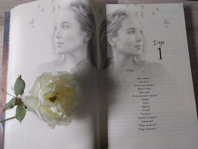 Tudo isso acontece basicamente em apenas um terço do livro e os dois restantes são juras de amor, drama, dificuldades de avançar a relação, histórias e momentos românticos no geral. Antes da metade do livro, a obra torna-se repetitiva, melosa e dramática em excesso, sempre com juras apaixonadas do Diogo e inseguranças da Emília. Também é importante dizer que o livro é narrado em primeira pessoa e sobre o ponto de vista intercalado dos dois personagens principais — apesar de ter um único capítulo aleatório e desnecessários narrado pela Rafaela — e consiste basicamente em duas coisas: diálogos e fluxos de pensamentos. Não há descrições de locais, ambientes e personagens, ou mesmo ações, somente as falas e os pensamentos do narrador daquele capítulo e quase sempre centrado no amor e no par romântico. Inclusive, em alguns diálogos com mais personagens, me perdi um pouco nas falas, sentindo falta de incisos que descrevessem quem é que estava falando. Outra coisa que me incomodou bastante foi a escrita em português de Portugal. Entendo que a autora é de lá e escreve assim, e tudo bem o Diogo dizer “Amo-te” e usar próclise e mesóclise corretamente em conversas informais. Porém, em diversos momentos personagens brasileiros falavam como os portugueses, usando expressões deles e estrutura de frases semelhantes às portuguesas. Como o livro foi lançado por editora brasileira, no Brasil, o revisor poderia ter alterado algumas expressões e palavras, tornando-as mais naturais para brasileiros nativos.
