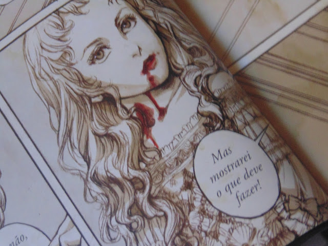 A diagramação da graphic novel está maravilhosa. Como vocês podem ver na imagem a cima, todas as ilustrações seguem com este efeito sépia, mas quando há fogo ou sangue há cor, destacando-se de todo o resto. E eu achei isso maravilhoso! Foi realmente bem pensado.