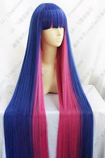 Começaremos pela peruca. Como vocês viram o cabelo dela é um azul escuro por cima e rosa por baixo. Eu olhei no AliExpress e encontrei duas perucas que gostei.